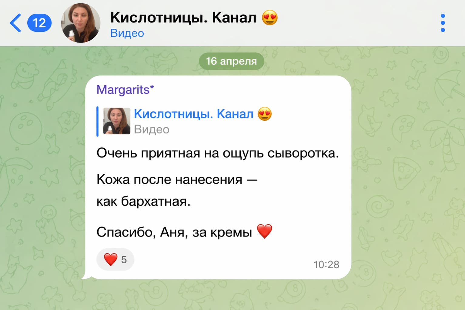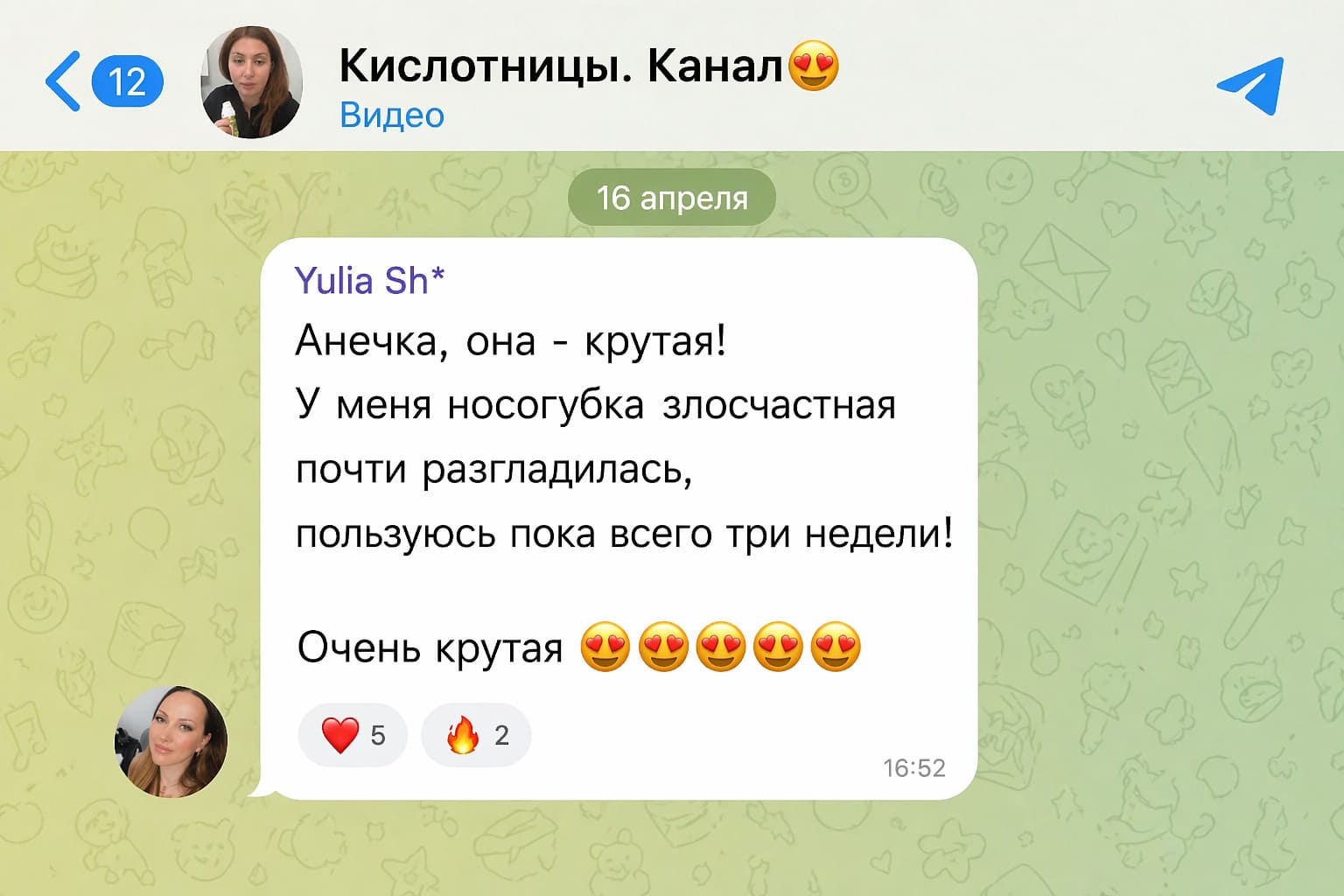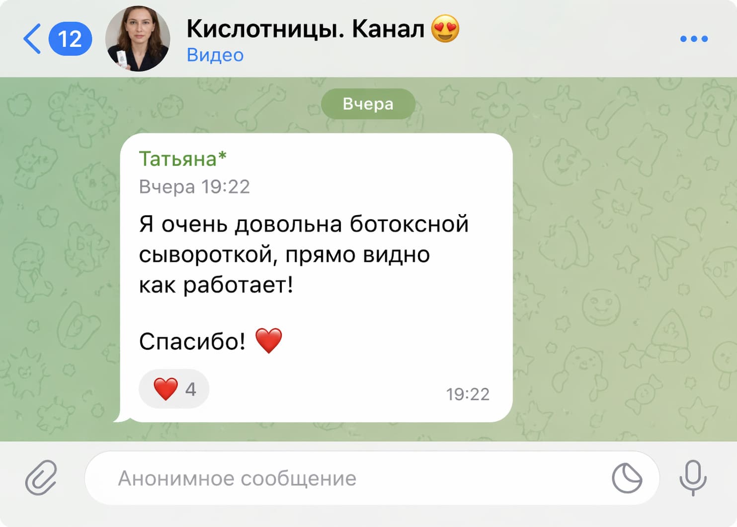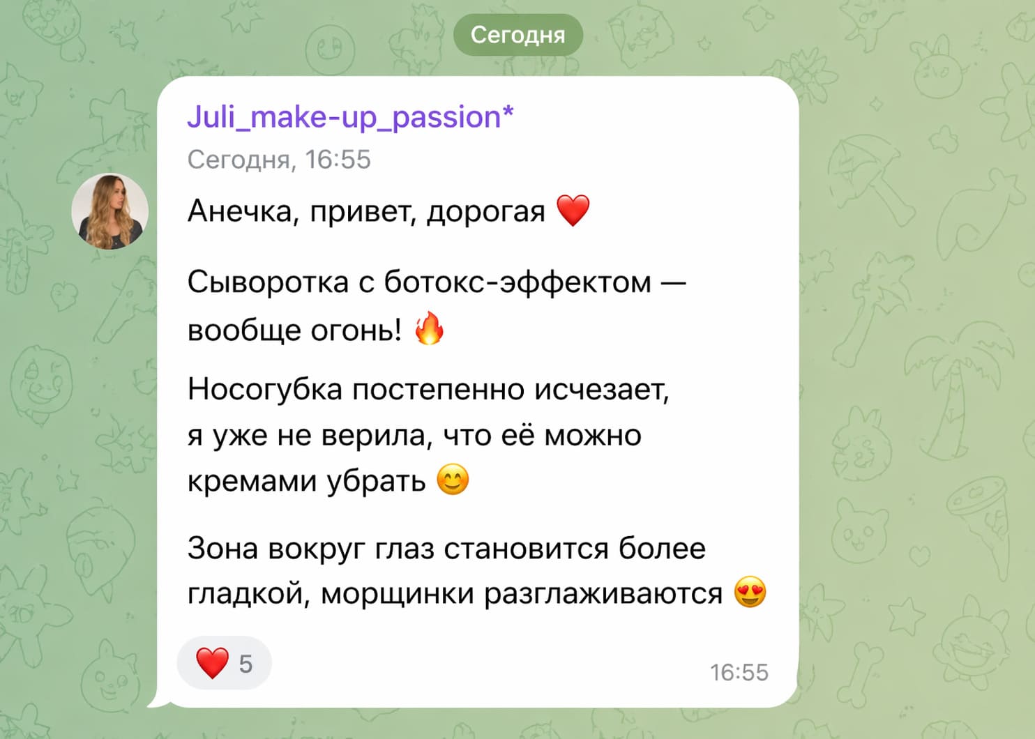 Хочу тебя поблагодарить, мне очень понравилась твоя сыворотка с ботоксом, после нескольких дней пользования даже на работе стали замечать изменения у меня на лице… спасибо тебе большое
