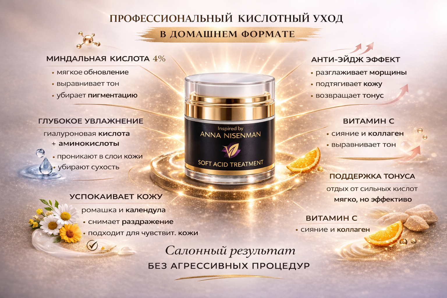 Night Care Cream with 4% Mandelic Acid has a gentle acidic effect on the skin. It’s the perfect choice for ladies who don’t have complex skin concerns but want to feel smooth, toned, and glowing skin daily.