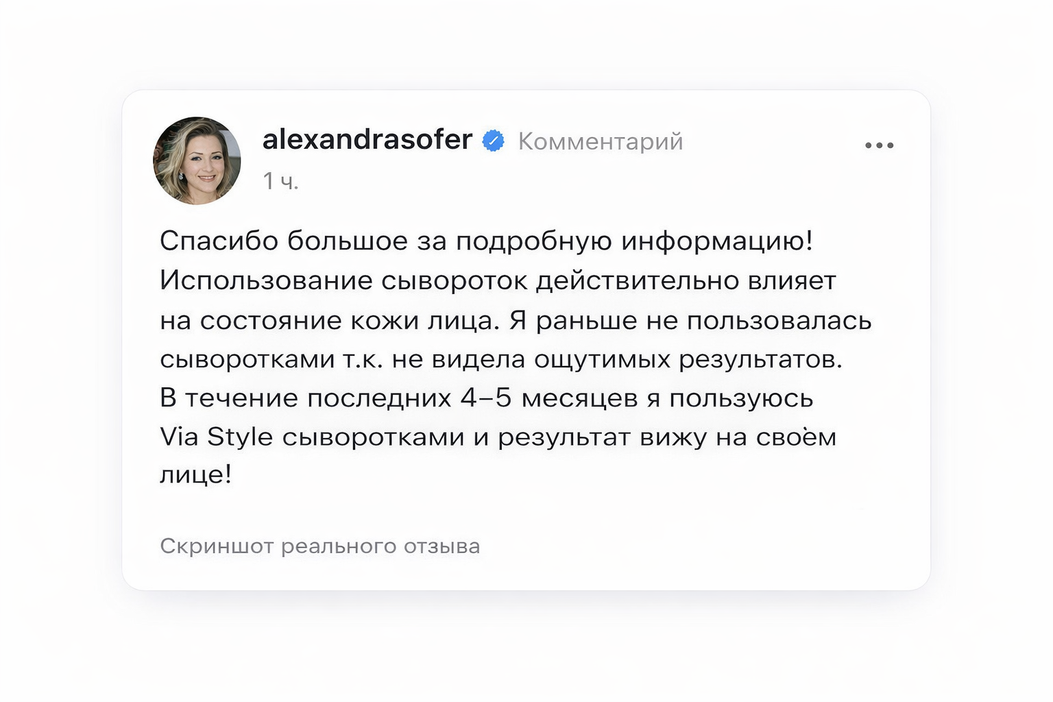 Девочки я только второй день использую сыворотку via complex, всё в комплексе. Очищение, кислоты, сыворотка via complex и крем. Эффект шикарный. Кожа бархатистая, гладкая, подтянутая, цвет лица свежий. Я довольна, как никогда.