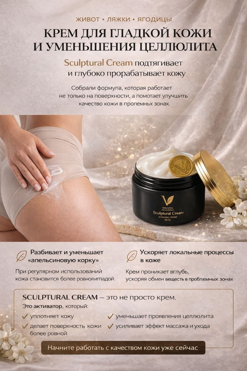 FitSculptural Cream — Инновационный крем для борьбы с целлюлитом — это эффективное средство улучшающее и ускоряющее кровообращение и обменные процессы в коже. Крем способствует расщеплению жировых клеток, уменьшает проявления целлюлита и растяжек. В состав входят клинически проверенные активные компоненты, которые обеспечивают заметные результаты в упругости и гладкости кожи.