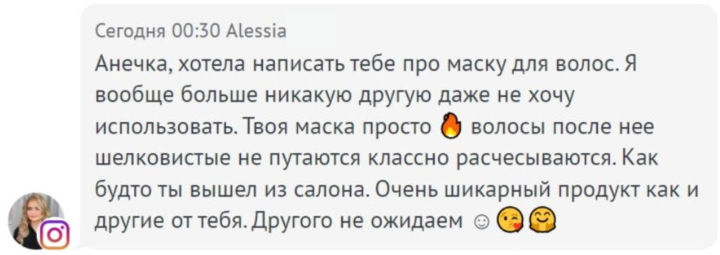 Я вообще больше никакую другую даже не хочу использовать. Твоя маска просто огонь!! Волосы после нее шелковистые не путаются классно расчесываются. Как будто ты вышел из салона. Очень шикарный продукт как и другие от тебя. Другого не ожидаем)