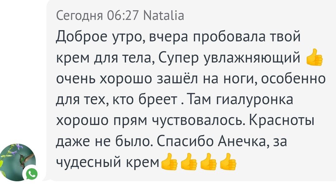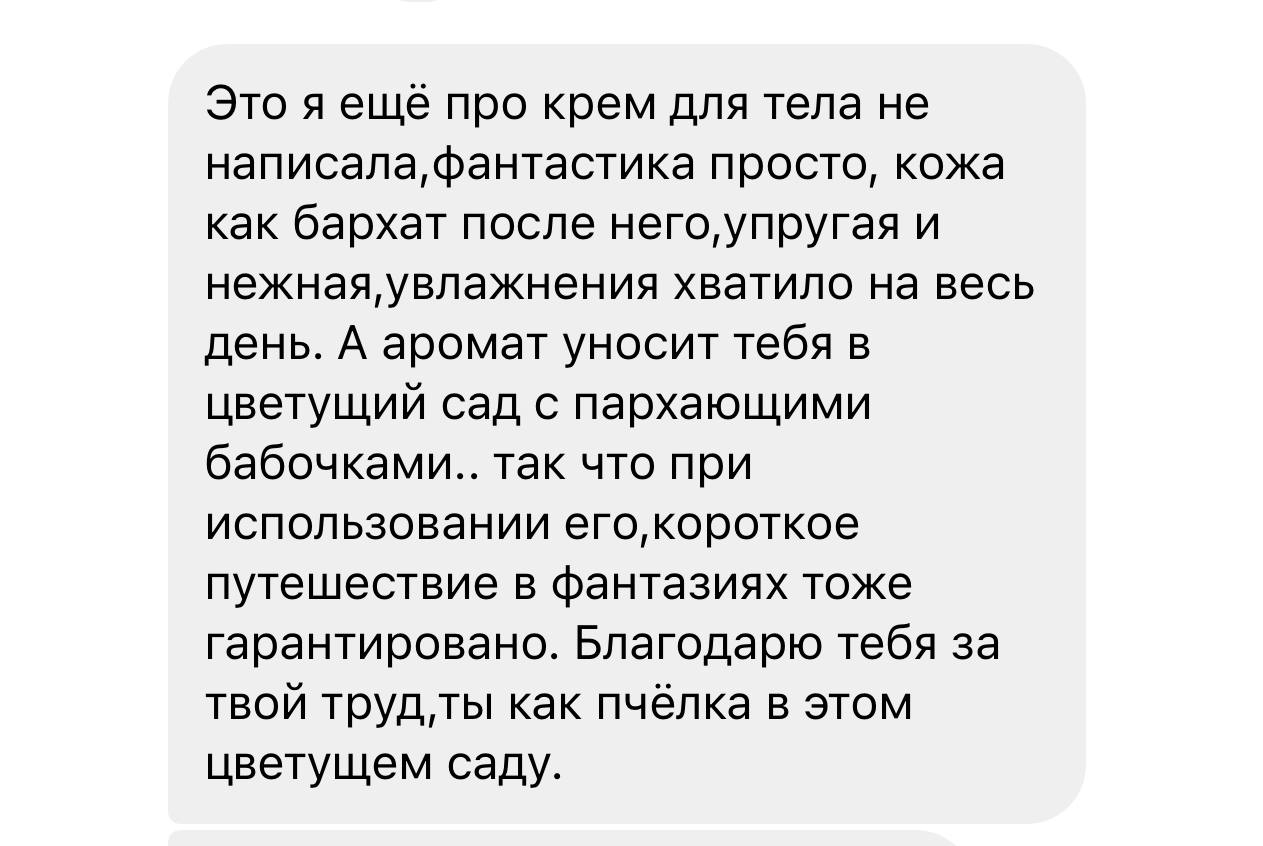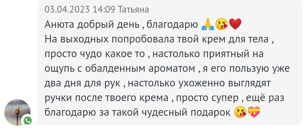 Кстати вчера попробовала ваш крем для тела, он просто прекрасный а аромат просто шикарный. Спасибо вам большое